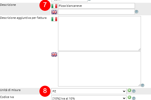 Inserisci la descrizione dell'articolo, usando ad esempio quella presente nel menù (7) e l'unità di misura (8):