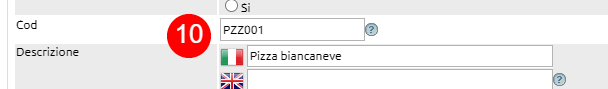 Se hai abilitato la codifica automatica degli articoli, il campo Cod. sarà generato in automatico (10) con il valore predisposto per la famiglia Pizze, altrimenti potrai inserire un codice manualmente.