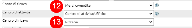 Imposta ora i dati contabili, utili per la reportistica di contabilità analitica, inserisci il conto di ricavo (12) e il centro di ricavo (13):