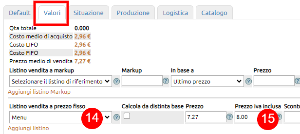 Sulla Tab Valori seleziona, tra quelli disponibili, il listino menù (14) e inserisci il prezzo iva inclusa (15):
