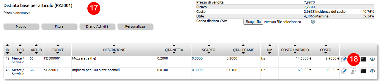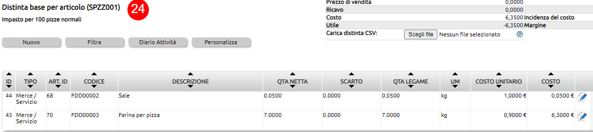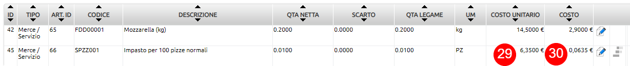 Ritornando alla schermata precedente, il costo unitario dell'impasto per 100 pizze normali (29) coinciderà con il valore della sua distinta base, mentre il costo (30) indica l'incidenza dello stesso all'interno della pizza biancaneve.