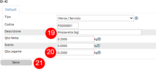 Richiama l'articolo inserendolo nella descrizione (19) e indica la quantità lorda nel campo quantità di legame - necessaria (20), quindi salva (21):