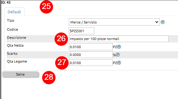 Dopo aver agganciato gli articoli sale e farina per pizza alla ricetta di IMPASTO PER 100 PIZZE NORMALI, devi agganciare questo ultimo articolo all'interno della distinta della PIZZA BIANCANEVE (25), quindi richiamare l'articolo inserendolo nella descrizione (26), indica la quantità lorda nel campo quantità di legame necessaria (27) quindi salva (28).