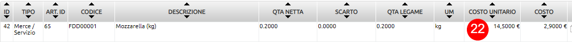 Il costo unitario (22) è inizialmente coincidente con il prezzo di acquisto indicato nella scheda anagrafica dell'articolo mozzarella per il fornitore preferenziale.