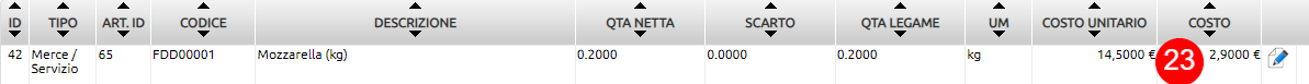 Il costo (23) corrisponde al prodotto tra la quantità legame e il costo unitario e rappresenta l'incidenza di costo del componente nella distinta base.