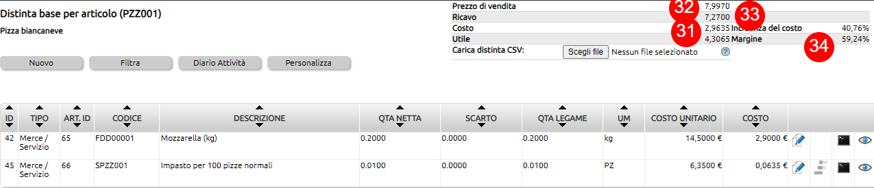 Noterai pure nello specchietto riepilogativo in alto come vengono registrati: il costo dell'articolo Pizza Biancaneve (31) dato dalla somma dei costi degli articoli che compongono la distinta base; il prezzo di vendita (32), il ricavo (33) dato dalla differenza tra il prezzo di vendita e il costo di acquisto; e il margine (34).